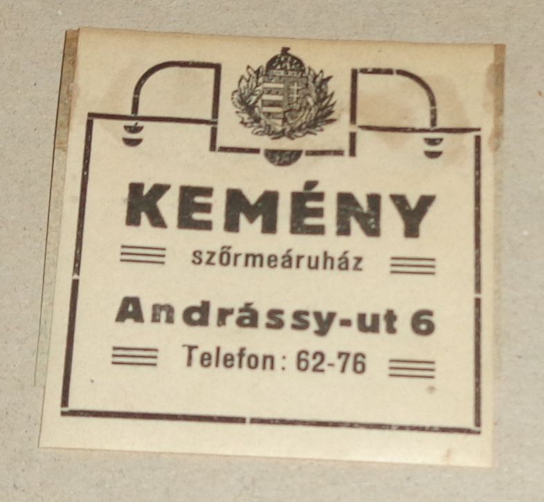 KEMÉNY szörmeáruház. reklám.