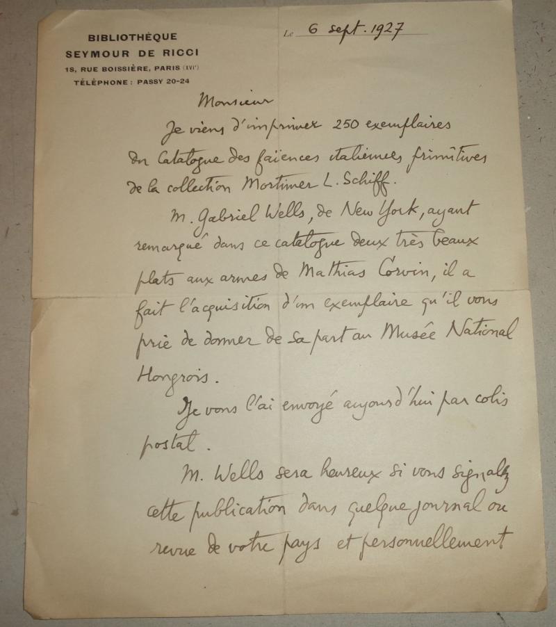 Mr. Gabriel Wells New Yorkból, észrevéve a katalógusban két nagyon szép, Mátyás Corvin címerével díszített tálat, megvásárolt egy példányt, amelyet az Ön nevében kér átadni a Magyar Nemzeti Múzeumnak.