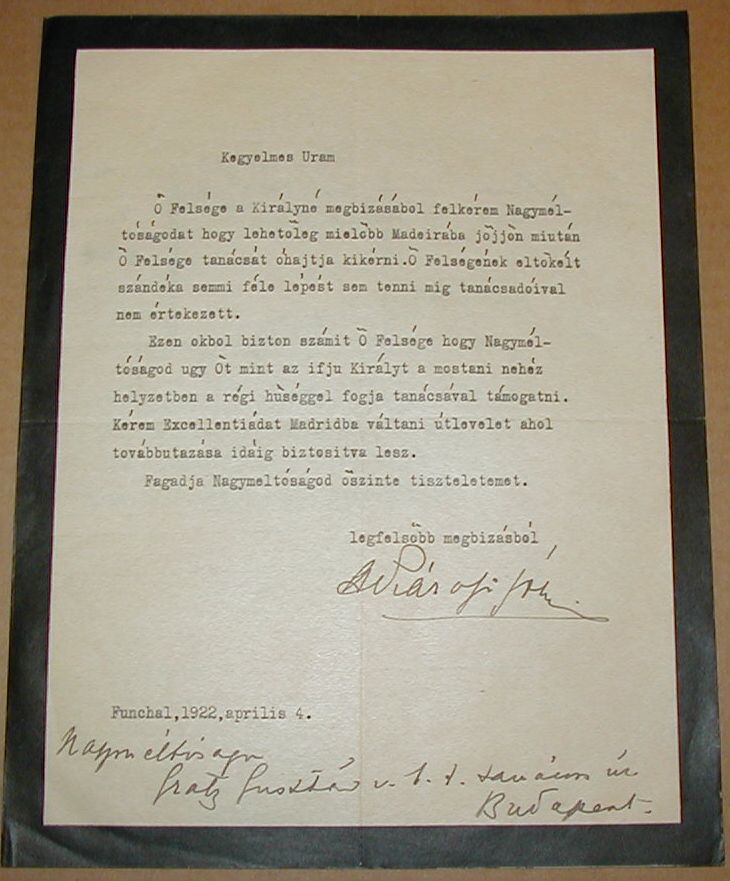 Károlyi József levele Gratz Gusztávnak, melyben Zita királyné nevében Madeirára hívja meg, feltételezhetően a király halála miatt.