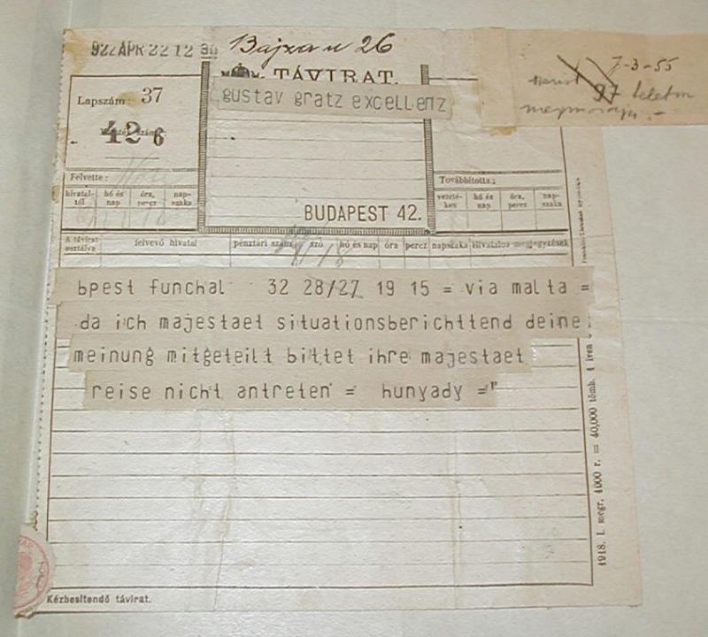 Hozzá tartozik Gratz Gusztávnak szóló távirat Hunyady aláírással
