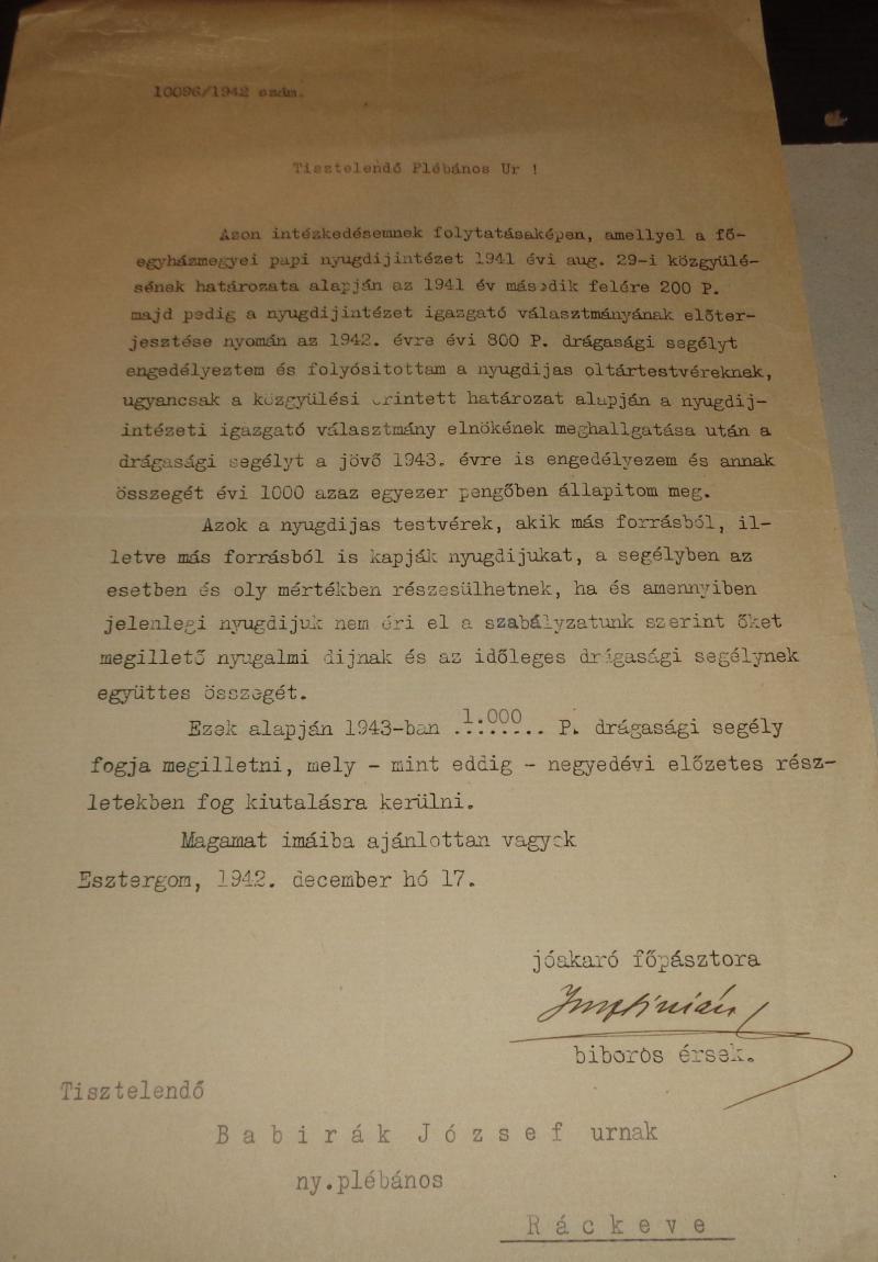 Serédy Justinián levele Babirák József plébánosnak.